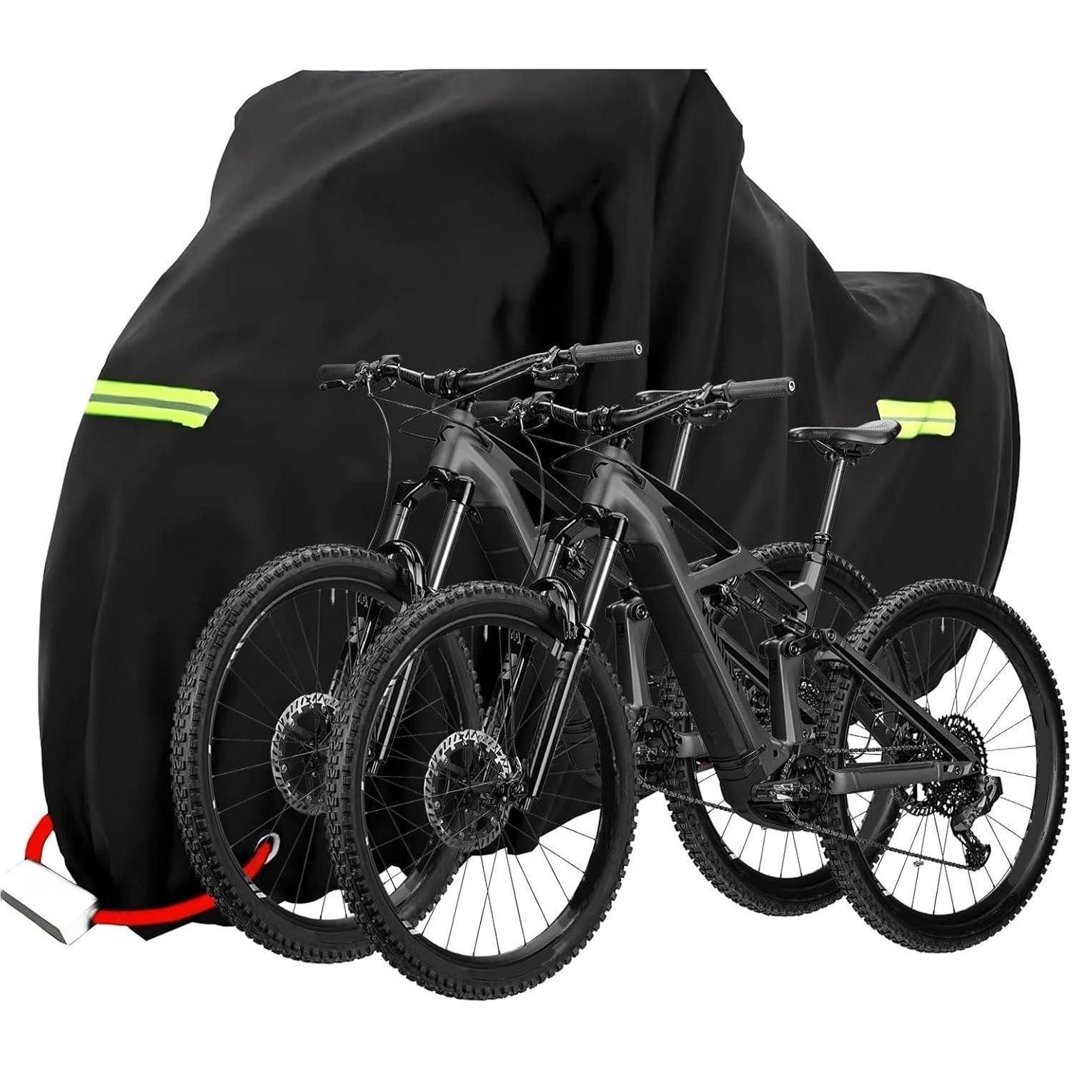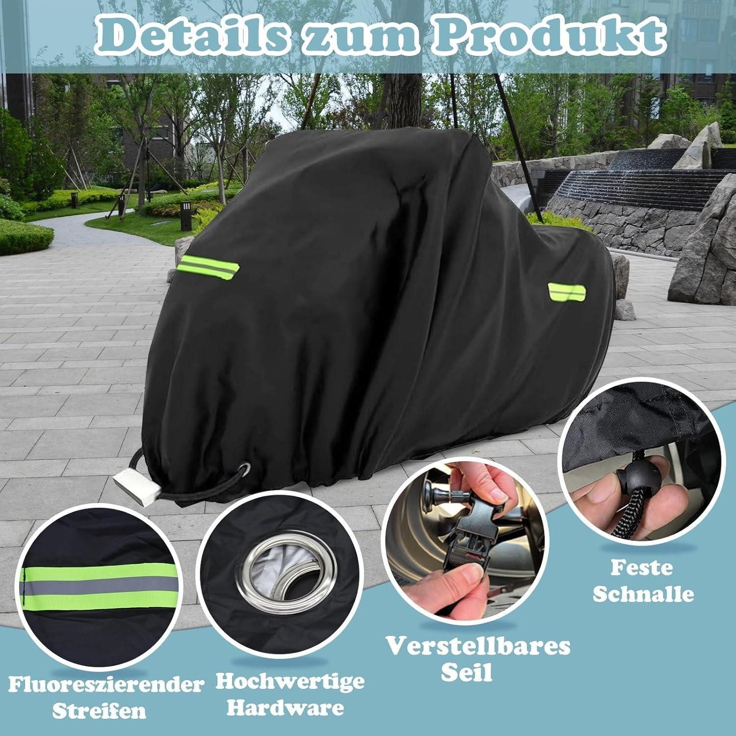 HINWEIS: Das Paket enthält nur eine Fahrradabdeckung und eine Aufbewahrungstasche, kein weiteres Zubehör! Bitte messen Sie Ihr Fahrrad vor dem Kauf. Die Fahrradabdeckung misst 205 x 110 x 80 cm und kann bis zu 2 große Fahrräder und 3 kleine Fahrräder aufnehmen. Das untere Ende der Abdeckung verfügt über ein Zugseil-Design, um die Abdeckung bei schlechtem Wetter festzuziehen und ein Wegwehen zu verhindern. Gefertigt aus hochwertigem Oxford-Fasergewebe, bietet die Abdeckung eine hervorragende Wasserbeständigkeit. Zudem sind 3 reflektierende Streifen für bessere Sichtbarkeit angebracht. Ein Schlossloch an der Vorderradposition ermöglicht es Ihnen, Ihr Fahrrad sicher abzuschließen. Investieren Sie in diese verbesserte Fahrradabdeckung und schützen Sie Ihre wertvollen Fahrräder optimal!